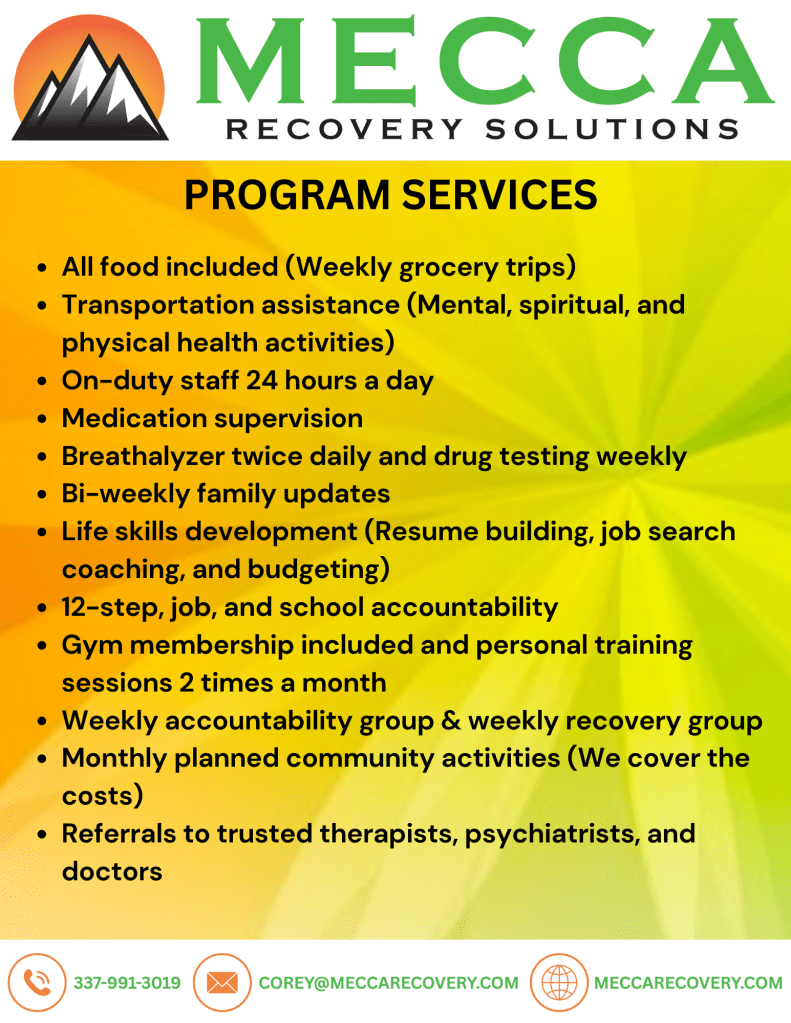 Corey Bowers, a 34-year-old from Lafayette, Louisiana, is the visionary founder of Mecca Recovery Solutions. His journey to recovery has been marked by determination, resilience, and profound personal transformation. Corey began abusing alcohol and pharmaceuticals in his teens. After facing severe consequences from drug addiction and alcoholism at a young age—including three arrests in a single month facing multiple felony charges, a major car accident that required surgery involving a titanium plate being screwed into his skull, and a deep battle with depression—Corey achieved sobriety at 19 years old in 2011 and maintained it for 6.5 years. After years of sobriety, Corey gradually drifted away from the daily practices of the 12-step program that had sustained his recovery, becoming increasingly distracted by life’s demands and the pursuit of external success. His path took a challenging turn when he faced multiple relapses. Corey was introduced to, and began using, harder substances off the streets. The severity of his substance use and the quantities consumed escalated rapidly. Heroin and alcohol took a strong hold of Corey. During this period, Corey cycled through detoxes, treatments, and sober living environments, struggling to regain a foothold in his recovery.